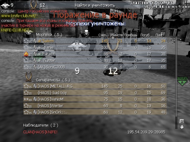 Итак, играли пред турнирное кв с хаосом. Все бились насмерть) Нашу дэбри выграли 12-10. Их перестрелку проиграли 9-12. Между картами были непонятки, т.к трейн использовал ключ блэйда, они подумали что за нас играет блэйд Потом все это разрешилось и 3 решающая мапа была отправа. Там мы их жоско наказали)))Вначале Счет был 9-1 но потом они более менее начали разумно играть и в итоге 12-4. Так что перед турниром мы являемся фаворитами)) Но глн цель это кнайф клуб. Так что не расслабляемся.